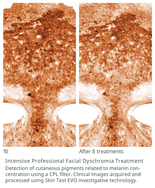 Le traitement vise à réduire progressivement les dyschromies. L’objectif n’est pas seulement de les atténuer visuellement, mais aussi de réguler les processus qui les causent : surproduction de mélanine, inflammation et stress oxydatif. Les résultats sont progressifs et durables, pas instantanés ni temporaires.