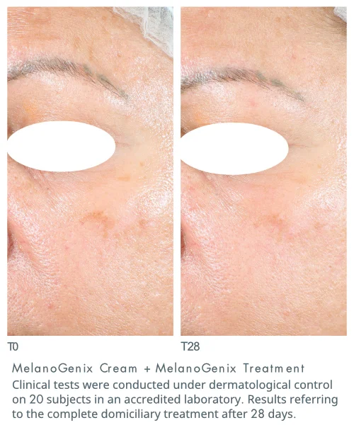 *Tests cliniques réalisés sous contrôle dermatologique sur un panel de 20 femmes âgées de 40 à 65 ans, dans un laboratoire certifié ; usage combiné de MELANOGENIX CREAM + MELANOGENIX TREATMENT pendant 28 jours.