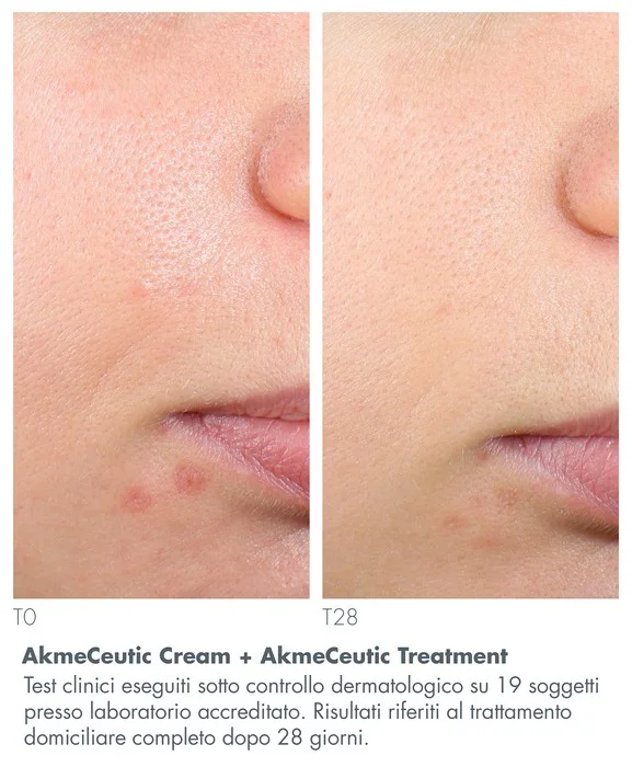 *Test clinici eseguiti sotto controllo dermatologico, su un panel di 19 donne dai 18 ai 40 anni, presso un Laboratorio certificato; uso combinato di AKMECEUTIC CREAM + AKMECEUTIC TREATMENT per 28 giorni.