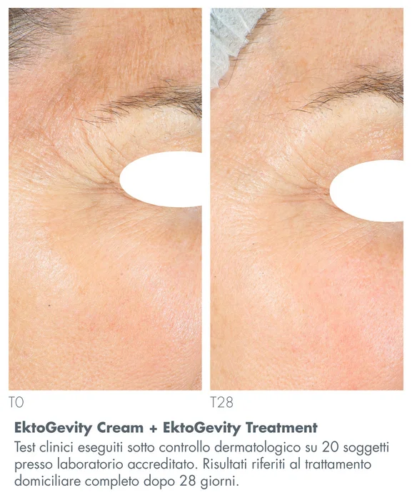 * Test clinici eseguiti sotto controllo Dermatologico, su un panel di 20 donne dai 45 ai 65 anni, presso un Laboratorio certificato; uso combinato di EKTOGEVITY CREAM + EKTOGEVITY TREATMENT per 28 giorni.