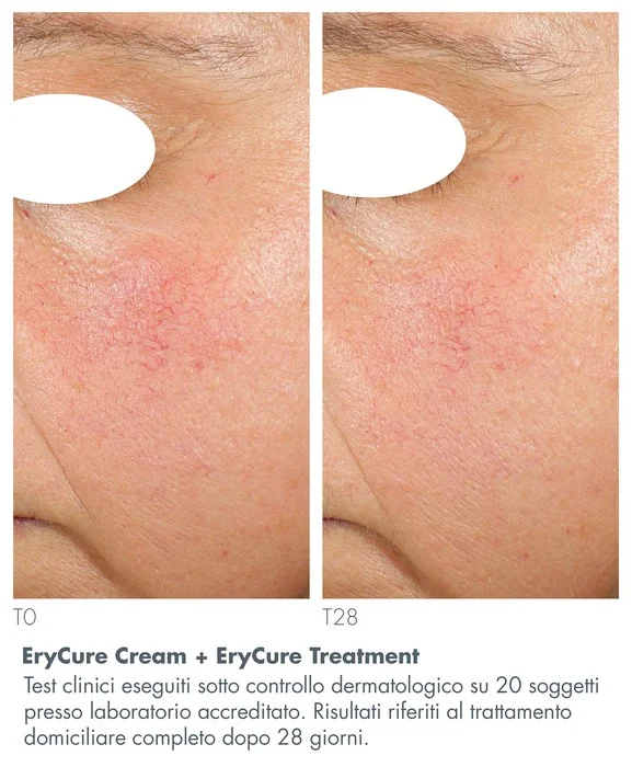 *Test clinici eseguiti sotto controllo Dermatologico, su un panel di 20 donne dai 30 ai 65 anni, presso un Laboratorio certificato; uso combinato di ERYCURE CREAM + ERYCURE TREATMENT per 28 giorni.