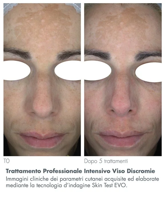 Il trattamento è mirato a ridurre progressivamente le discromie. L’obiettivo non è solo attenuarle visivamente, ma anche modulare i processi che le generano: sovrapproduzione di melanina, infiammazione e stress ossidativo. I risultati sono progressivi e stabili, non immediati ma temporanei.