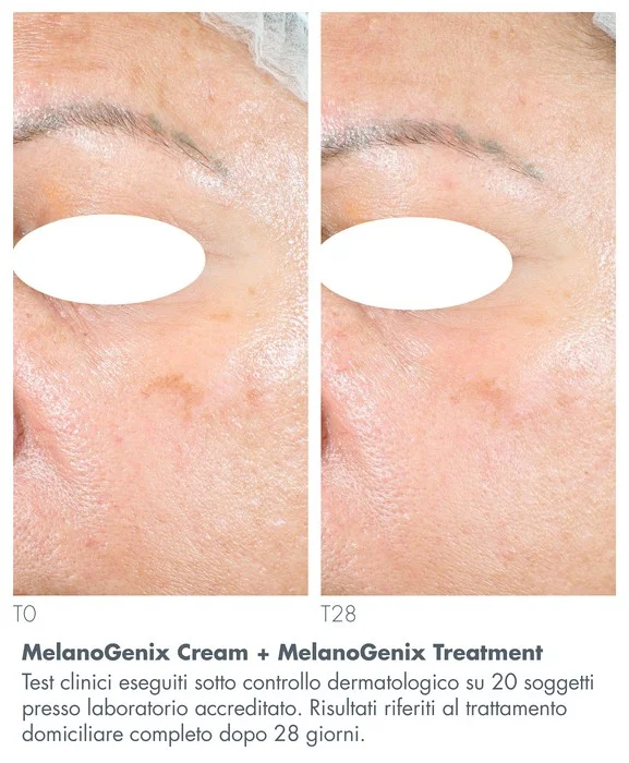 *Test clinici eseguiti sotto controllo Dermatologico su un panel di 20 donne dai 40 ai 65 anni, presso un Laboratorio certificato; uso combinato di MELANOGENIX CREAM + MELANOGENIX TREATMENT per 28 giorni.